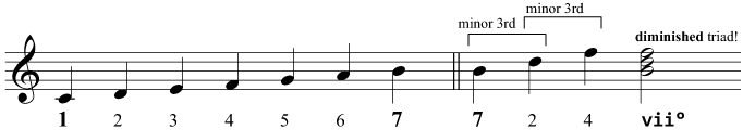 The construction of the diminished triadNote that this triad is different from the major triad and the minor triad, in that it is built from two minor thirds; the major triad is built from a major third with a minor third on top, and the minor triad is built from a minor third with a major third on top.