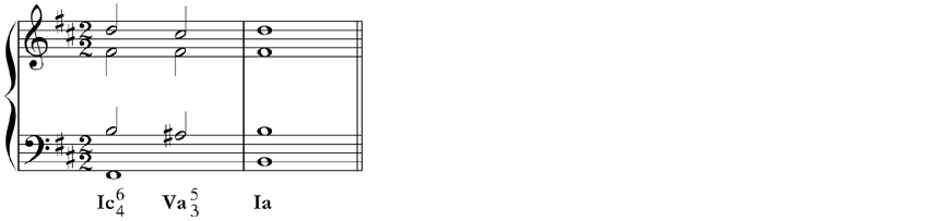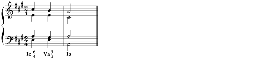 In B minor - with the all-important raised leading note in the Va chordIn all these cases, you can see that the perfect cadence has been harmonised with an approach chord of Ic followed by Va, to end on Ia. The sequence Ic-Va shares a bass note, and is a very common chord progression.