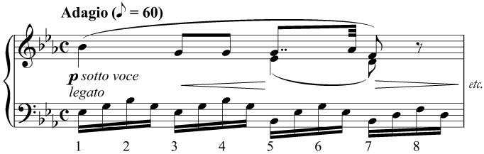 Compare these two examples, from the same piano sonata by Mozart; the first is from a fast 1st movement: